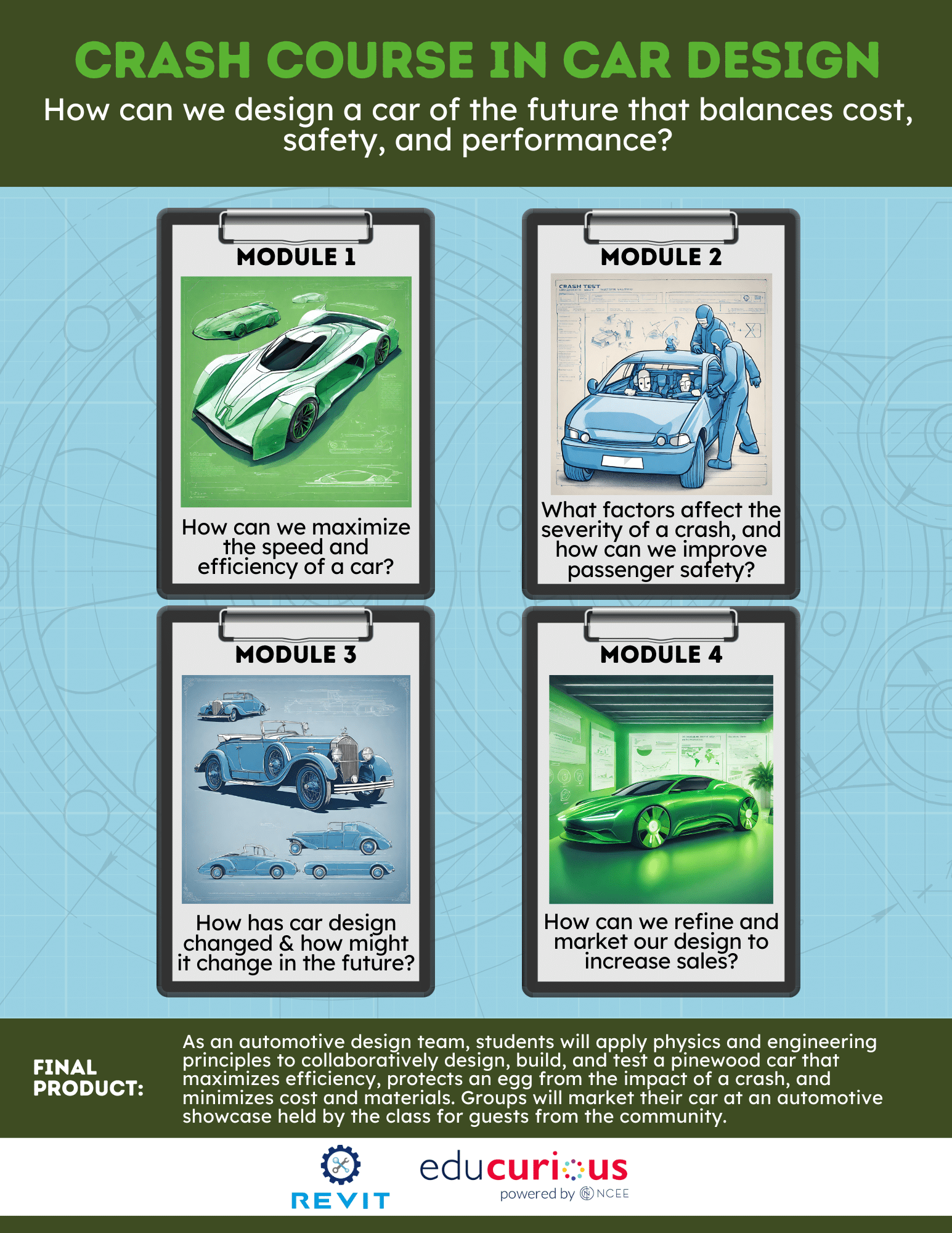 To complete their final product, students will progress through the modules of the unit to investigate how to maximize the speed and efficiency of a car, the factors affecting the severity of a crash and ways to improve passenger safety, the evolution of car design and potential future changes, and strategies for refining and marketing their car design to increase sales.
