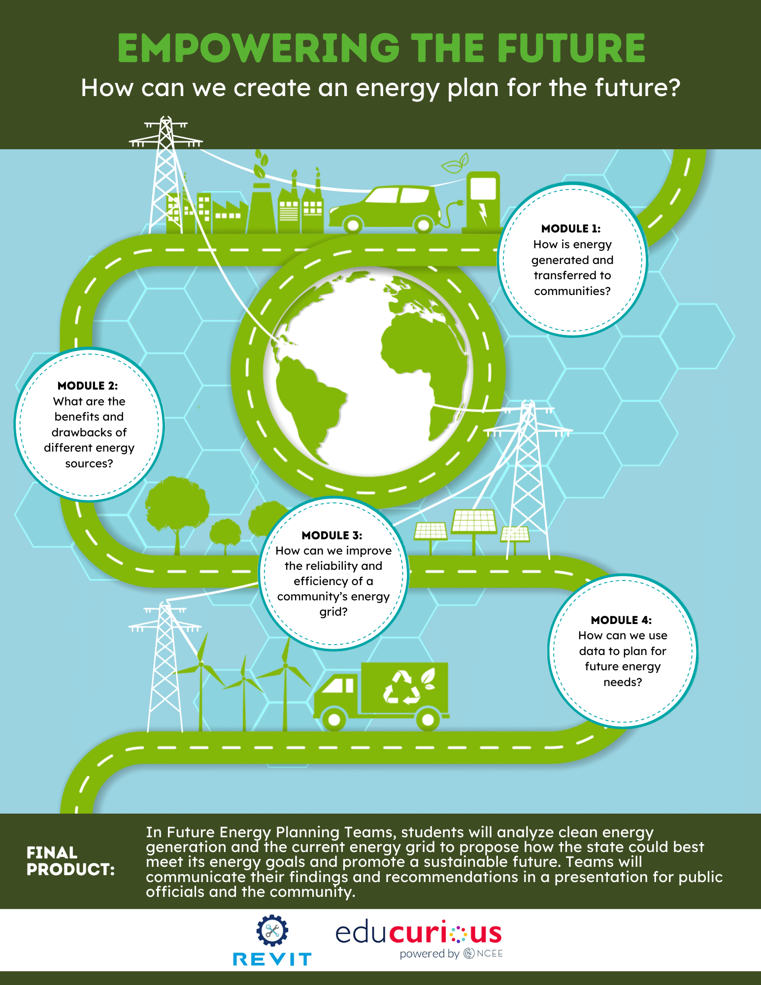 In this unit, students will explore clean energy generation and their state's current energy grid by addressing the driving question, "How can we create an energy plan for the future?" in order to propose how the state could best meet its energy goals and promote a sustainable future. Energy Planning Teams will communicate their findings and recommendations in a presentation for public officials and the community. To complete their final product, students will progress through the modules of the unit to investigate how energy is generated and transferred to communities, the benefits and drawbacks of different energy sources, ways to improve the reliability and efficiency of a community’s energy grid, and how to use data to plan for future energy needs.