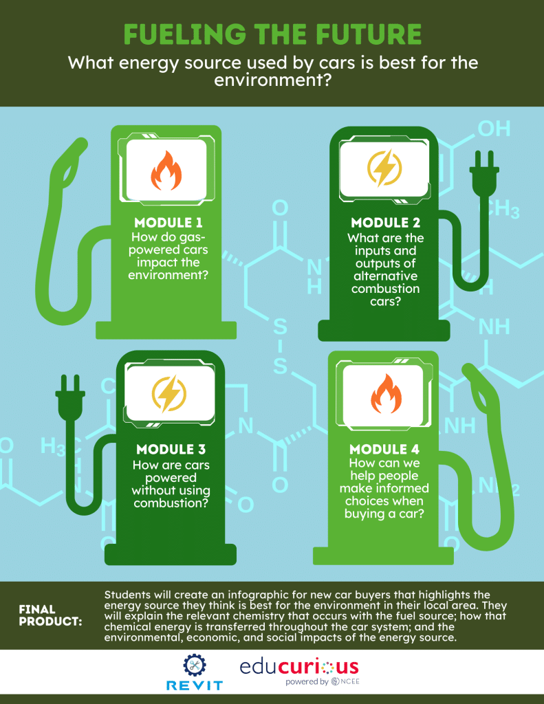 To complete their final product, students will progress through the modules of the unit to investigate how gas-powered cars impact the environment, analyze the inputs and outputs of alternative combustion cars, and examine how cars can be powered without using combustion. They’ll also learn to help people make informed choices when buying a car.