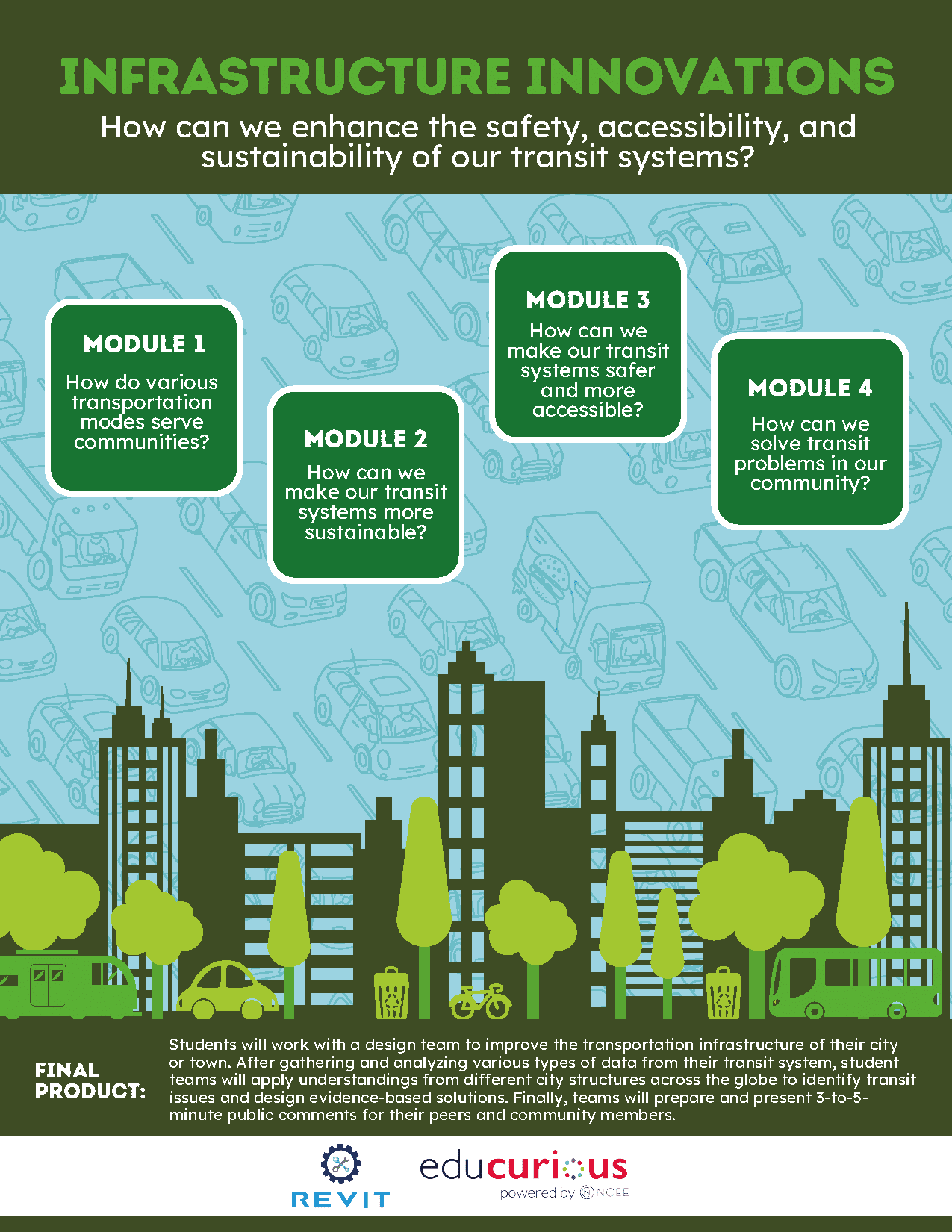 To complete their final product, students will progress through the modules of the unit to investigate how various transportation modes serve communities, how to make transit systems more sustainable, how to improve safety and accessibility, and how to solve transit problems in their community.
